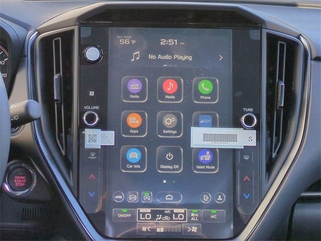 - Radio: Subaru 11.6" Multimedia Plus System -inc: valet mode, AM/FM stereo, HD Radio, multi-touch gesture high resolution display screen, voice activated controls, Bluetooth® audio streaming and hands-free phone connectivity, Bluetooth® hands-free SMS text messaging connectivity, iPod control capability, smartphone integration: wired and wireless Android Auto w/full screen view, wireless Apple CarPlay w/full screen view and wireless connection, USB and Over The Air (OTA) audio system update, audio system and Bluetooth® steering wheel control switches, 6 speakers (2 dash panel tweeter, 2 front door, 2 rear door), illuminated 3.5mm auxiliary input jack, illuminated USB A and C input charge ports, roof mounted satellite and connected services, roof mounted black antenna, connected services operation indicator, SOS emergency assistance (red button) and ehanced roadside assistance (blue i-button)